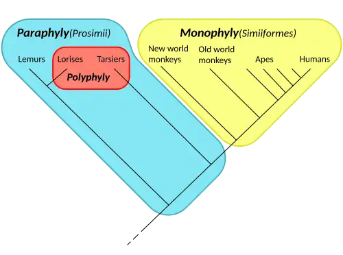 Cladogram of the primates, showing a monophyletic taxon (a clade: the simians or Anthropoidea, in yellow), a paraphyletic taxon (the prosimians, in blue, including the red patch), and a polyphyletic taxon (the nocturnal primates – the lorises and the tarsiers – in red)