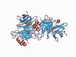 Clathrin is a protein that plays a role in the formation of coated vesicles. Clathrin was first isolated by Barbara Pearse in 1976.[1] It forms a triskelion shape composed of three clathrin heavy chains and three light chains. When the triskelia interact they form a polyhedral lattice that surrounds the vesicle. The protein's name refers to this lattice structure, deriving from Latin clathri, meaning lattice.[2] Barbara Pearse named the protein clathrin at the suggestion of Graeme Mitchison, selecting it from three possible options.[3] Coat-proteins, like clathrin, are used to build small vesicles in order to transport molecules within cells. The endocytosis and exocytosis of vesicles allows cells to communicate, to transfer nutrients, to import signaling receptors, to mediate an immune response after sampling the extracellular world, and to clean up the cell debris left by tissue inflammation. The endocytic pathway can be hijacked by viruses and other pathogens in order to gain entry to the cell during infection.[4]