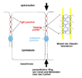 Claudins have both cis and trans interactions between cell membranes.[6] Cis-interactions is when claudins on the same membrane interact, one way they interact is by transmembrane domain having molecular interactions.[7] Trans-interaction is when claudins of neighboring cells interact through their extracellular loops.[8] Cis-interactions is also known as side-to-side interactions and trans-interactions is also known as head-to-head interactions.[9]