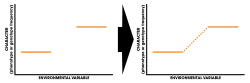The steepness, or gradient, of a cline reflects the extent of the differentiation in the character across a geographic range.[2] For example, a steep cline could indicate large variation in the colour of plumage between adjacent bird populations. It has been previously outlined that such steep clines may be the result of two previously allopatric populations with a large degree of difference in the trait having only recently established gene flow, or where there is strong selection against hybrids. However, it may also reflect a sudden environmental change or boundary. Examples of rapidly changing environmental boundaries like this include abrupt changes in the heavy metal content of soils, and the consequent narrow clines produced between populations of Agrostis that are either adapted to these soils with high metal content, or adapted to "normal" soil.[2][18] Conversely, a shallow cline indicates little geographical variation in the character or trait across a given geographical distance. This may have arisen through weak differential environmental selective pressure, or where two populations established secondary contact a long time ago and gene flow has eroded the large character differentiation between the populations.
