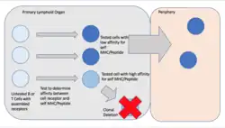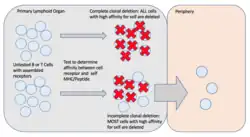 In immunology, clonal deletion is the process of removing T and B lymphocytes from the immune system repertoire.[1][2] The process of clonal deletion helps prevent recognition and destruction of the self host cells, making it a type of negative selection. Ultimately, clonal deletion plays a role in central tolerance.[3] Clonal deletion can help protect individuals against autoimmunity, which is when an organism produces and immune response on its own cells. It is one of many methods used by the body in immune tolerance.