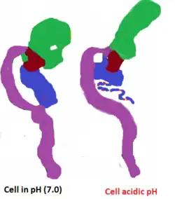 To see whether effects of proteolytic cleavage of TcdB takes place at the cell surface or in acidic endosomes, studies used Bafilomycin A1, which is known to block the v-type H+-ATPases of endosomes. This reduces the acidity in endosomes.[31] The physiological uptake pathway of TcdB prevents cytopathic activity by TcdB.[31] When cells were in acidic conditions (pH 4.0) for 5 minutes after binding TcdB to the cell surface at 37 degree Celsius, the shape rearrangements and rounding were observed. However, when rounded cells were incubated for an additional hour in neutral pH (7.0) with similar parameters, no cell rounding was observed.[15][31] Both studies showed that toxin B has a property of proteolytic cleavage, which is critical for access to the cytosol.[7][15][31] Having an acidic endosome pH leads to topological alterations of TcdB (Figure 6).[7]