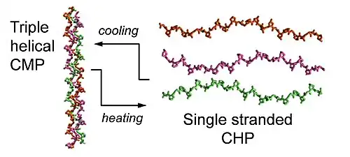 Collagen is the main component of the extracellular matrix (ECM).[7] The collagen superfamily consists of 28 different types of collagen.[7] Although the function and hierarchical structure of these collagens may vary, they all share the defining structural feature known as the triple helix,[1] where three left handed polyproline II-type (PPII) helices assemble to form a right-handed supercoiled helical motif.[1][8] Short synthetic peptides known as collagen mimetic peptides (CMPs) or collagen-like peptides (CLPs) have played a major role in elucidating the 3D structure of the collagen triple helix, its folding kinetics, and thermal stability as small triple helical models.[3][9][10][11] CMPs, CLPs, and CHPs are all very similar in terms of their amino acid sequences but only when CMPs or CLPs are heated above their melting temperatures, do they exist in the dissociated, single-stranded state and can be considered as CHPs.[2]
