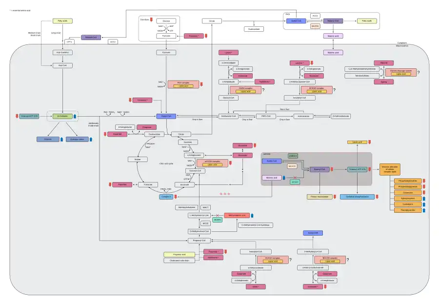 The deficiency of ACSF3 in CMAMMA leads to an accumulation of malonic acid and a mitochondrial deficiency of malonyl-CoA.[12] While malonic acid competitively inhibits complex II and has a cytotoxic effect, the deficiency of the substrate malonyl-CoA in turn leads to reduced malonylation of mitochondrial proteins, which affects the activity of metabolic enzymes and alters cell metabolism.[12] However, the malonyl-CoA demand can still be met in part via the enzyme mtACC1, a mitochondrial isoform of acetyl-CoA carboxylase 1 (ACC1), which explains the broad clinical phenotype of CMAMMA.[13] The deficiencies of intermediates can be continued to the major mtFAS product, octanoyl-ACP, which is required as a starting substrate for the biosynthesis of lipoic acid, for the assembly of the complexes of oxidative phosphorylation and as an endogenous substrate for β-oxidation.[3] Important mitochondrial multienzyme complexes such as those from energy metabolism, the pyruvate dehydrogenase complex (PDHC), the α-ketoglutarate dehydrogenase complex (α-KGDHC) and from amino acid metabolism, the branched-chain alpha-keto acid dehydrogenase complex (BCKDHC), the oxoadipate dehydrogenase complex (OADHC) and the glycine cleavage system (GCS), are dependent on lipoic acid as a covalent cofactor for their functionality.[14][15] As a consequence, the reduced lipoylation of the pyruvate dehydrogenase complex and the α-ketoglutarate dehydrogenase complex leads to a reduced glycolytic flux, measured in glycolysis and glycolytic capacity.[3] To likely compensate for the cell's energy demand, an upregulation of fatty acid β-oxidation and a decreased concentration of amino acids that feed anaplerotically into the citric acid cycle, such as aspartate, glutamine, isoleucine, threonine and leucine, could be detected.[3] In summary, the reduced mitochondrial respiration and glycolytic flux results in impaired mitochondrial flexibility with a large dependence on fatty acid β-oxidation and an increased consumption of anaplerotic amino acids.[3][13]
