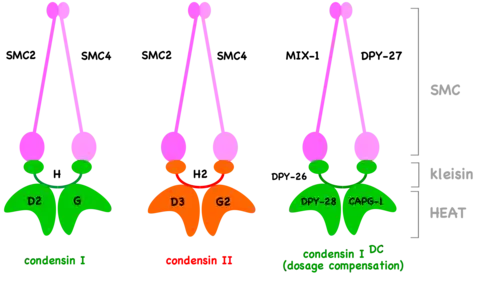 - The nematode Caenorhabditis elegans possesses both condensins I and II. This species is, however, unique in the sense that it has a third complex (closely related to condensin I) that participates in chromosome-wide gene regulation, i.e., dosage compensation.[11] In this complex, known as condensin IDC, the authentic SMC4 subunit is replaced with its variant, DPY-27 (Figure 2).