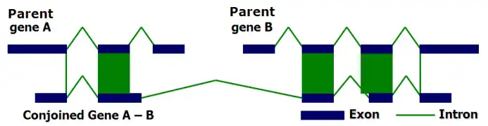{{cite journal}}: CS1 maint: DOI inactive as of March 2025 (link) - ↑ Prakash T, Sharma VK, Adati N, Ozawa R, Kumar N, et al. (October 2010). Michalak P (ed.). "Expression of Conjoined Genes: Another Mechanism for Gene Regulation in Eukaryotes". PLOS ONE. 5 (10): e13284. Bibcode:2010PLoSO...513284P. doi:10.1371/journal.pone.0013284. PMC 2953495. PMID 20967262.
