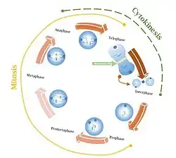 In molecular biology, an actomyosin ring or contractile ring, is a prominent structure during cytokinesis.[1] It forms perpendicular to the axis of the spindle apparatus[2] towards the end of telophase, in which sister chromatids are identically separated at the opposite sides of the spindle forming nuclei (Figure 1). The actomyosin ring follows an orderly sequence of events: identification of the active division site, formation of the ring, constriction of the ring, and disassembly of the ring.[1] It is composed of actin and myosin II bundles, thus the term actomyosin. The actomyosin ring operates in contractile motion,[3] although the mechanism on how or what triggers the constriction is still an evolving topic.[4] Other cytoskeletal proteins are also involved in maintaining the stability of the ring[5] and driving its constriction.[6] Apart from cytokinesis, in which the ring constricts as the cells divide (Figure 2), actomyosin ring constriction has also been found to activate during wound closure.[7] During this process, actin filaments are degraded, preserving the thickness of the ring. After cytokinesis is complete, one of the two daughter cells inherits a remnant known as the midbody ring.[8]
