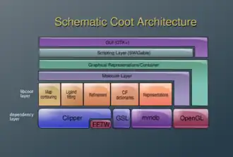 Coot is built upon a number of libraries. Crystallographic tools include the Clipper library[7] for manipulating electron density and providing crystallographic algorithms, and the MMDB[8] for the manipulation of atomic models. Other dependencies include FFTW, and the GNU Scientific Library.