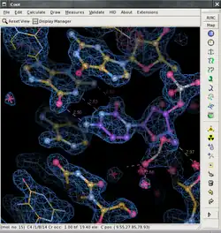 The program Coot (Crystallographic Object-Oriented Toolkit)[2][3] is used to display and manipulate atomic models of macromolecules, typically of proteins or nucleic acids, using 3D computer graphics. It is primarily focused on building and validation of atomic models into three-dimensional electron density maps obtained by X-ray crystallography methods, although it has also been applied to data from electron microscopy.