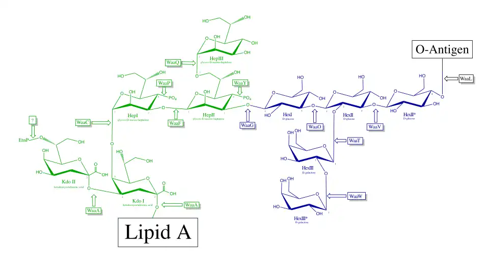 The enzymes involved in core oligosaccharide synthesis are conserved among Escherichia coli and Salmonella. Pseudomonas aeruginosa has some unique enzymes.[3]: 273