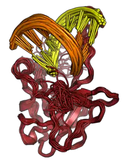 The C-terminal dimer has been structurally characterized by X-ray crystallography for several coronaviruses and has a highly conserved structure.[7] The N-terminal domain - sometimes known as the RNA-binding domain, though other parts of the protein also interact with RNA - has also been crystallized and has been studied by nuclear magnetic resonance spectroscopy in the presence of RNA.[10]