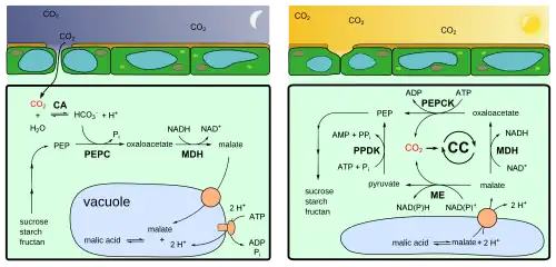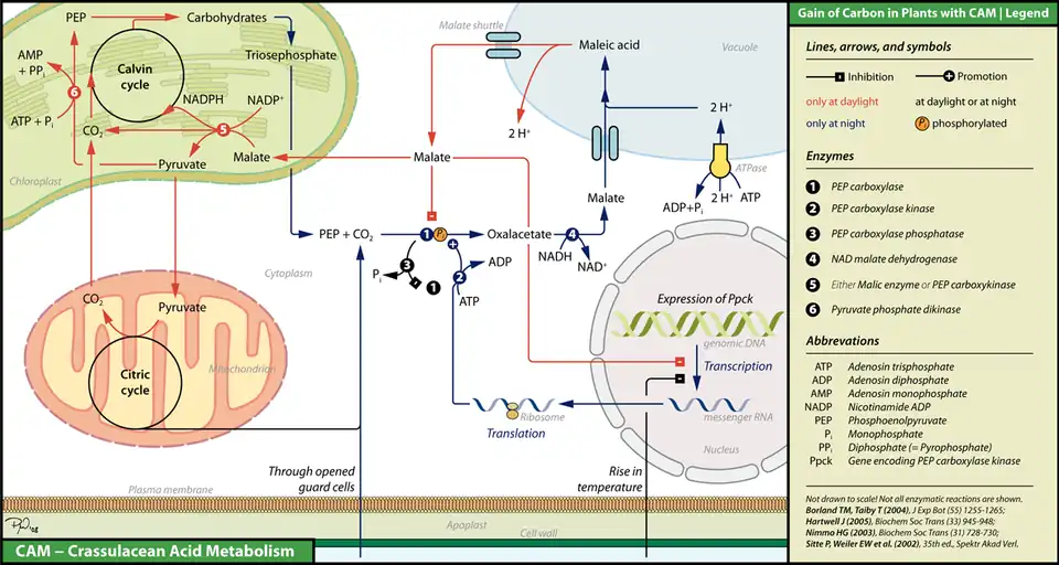 - 1 2 Lüttge U (June 2004). "Ecophysiology of Crassulacean Acid Metabolism (CAM)". Annals of Botany. 93 (6): 629–652. doi:10.1093/aob/mch087. PMC 4242292. PMID 15150072.