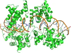 ![]() Structure of a Cre recombinase enzyme (dimer) bound to its substrate DNA | |||||||