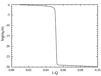 The population of the master sequence as a fraction of the total population (n) as a function of overall mutation rate (1-Q). The total number of digits per sequence is L=100, and the master sequence has a selective advantage of a=1.05. The "phase transition" is seen to occur at roughly 1-Q=0.05.