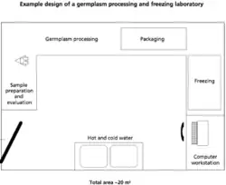 A freezing and processing laboratory for genetic materials can be on the same site as the holding and collecting facility. However, the laboratory must have higher sanitation standards. According to the FAO, a proper germplasm laboratory should include the following.[1]