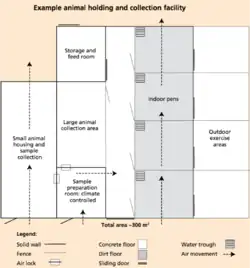 Biosecurity, a management measure used to prevent the transmission of diseases and disease agents on the facility, is important to keep in mind when designing a facility.[39] In order to achieve a high level of biosecurity, collection facilities should be placed as far as possible from one another, as well as from farms. According to the FAO's recommendations, facilities should be "at least 3 km from farms or other biological risks and 1 km from main roads and railways".[1] Separation between collection facilities and surrounding farms can improve biosecurity as pests, such as flies and mice, have the potential to travel from farm to facility and vice versa. Other disease agents may be able to travel through the air via wind, furthering the importance of separation of farms and proper air sanitation and ventilation. Additionally, a perimeter fence is used to prevent potential threats that could cause contamination to germplasms, such as unauthorized personnel or unwanted animals, from entering the facilities. Animals may be housed in pens located inside or outside of a barn as long as they are contained within the perimeter fence. When interaction with outside objects, such as feed trucks or veterinary personnel, is necessary, complete sanitation is required to decrease the risk of contamination. There is always the possibility of disease spreading among the animals whose biological data is being collected or from animal to human. An example of a disease that can easily spread through germplasm is Porcine Reproductive and Respiratory Syndrome, otherwise known as PRRS. A highly contagious disease between swine, PRRS causes millions of dollars to be lost annually by producers. The disease can be spread through boar semen.[40] Therefore, biosecurity is particularly important when genetic material will be inserted into another animal to prevent the spread of such diseases.