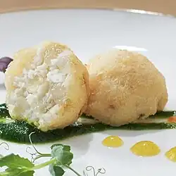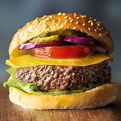 The first cultured beef burger patty was created by Mark Post at Maastricht University in 2013.[62] It was made from over 20,000 thin strands of muscle tissue, cost over $325,000 and needed 2 years to produce.[63] The burger was tested on live television in London on 5 August 2013. It was cooked by chef Richard McGeown of Couch's Great House Restaurant in Polperro, Cornwall, and tasted by critics Hanni Rützler, a food researcher from the Future Food Studio, and Josh Schonwald. Rützler stated, "There is really a bite to it, there is quite some flavour with the browning. I know there is no fat in it so I didn't really know how juicy it would be, but there is quite some intense taste; it's close to meat, it's not that juicy, but the consistency is perfect. This is meat to me... It's really something to bite on and I think the look is quite similar." Rützler added that even in a blind trial she would have taken the product for meat rather than a soya copy.[64]