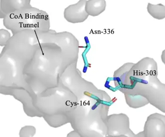 Crystallization studies [6] have determined that curcumin synthase is a homodimer of ketosynthase subunits.[2][7] Each includes a highly conserved Cys (164), His (303), Asn (336) catalytic triad, and CURS1 has been shown to exhibit the αβαβα folding pattern,[6] conserved features of type III PKSs.[7][8] The catalytic triads are independent of each other and are contained in the center of each monomer, connected to the surface with a CoA binding tunnel.[6] While CURS1, 2, and 3 share approximately 80% amino acid sequence identity, their small structural differences account for their differences in preferred starter substrates and most prolific product.[1]