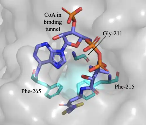 The well conserved catalytic triad sits at the end of a hydrophobic cavity, referred to as the CoA binding tunnel, that allows for the specificity of curcumin synthase for the CoA moiety. The triad, displayed in a PyMOL image below, despite being buried in each monomer, is connected to the surface of the binding tunnel, allowing interactions with substrates. The pockets of the protein show this tunnel and where the β-keto acid tail of feruloyl-CoA can fit into, which we can also see in the photo of the CoA binding tunnel reaching towards the catalytic triad. In addition to the catalytic triad, there are two conserved phenylalanine residues, Phe-215 and Phe-265, and a glycine, Gly-211, that contribute to the nature of the hydrophobicity pocket. The phenylalanines are named the “gatekeepers,” which allow for the correct tunnel width for CoA. The Gyl-211 can be mutated to affect the trafficking of this pocket, as bulkier residues can occupy the hydrophobic cavity. CURS1 has not been crystallized with CoA, but chalcone synthase, which is another type III PKS, has been shown bound to CoA. CHS and curcumin synthase have the same catalytic triad and CoA binding tunnel, so we can look at the nature of binding. The CoA is held tightly in the CoA binding tunnel in the image of conserved residues, showing where it can connect to these gatekeepers and traffic guards of important residues.[6]