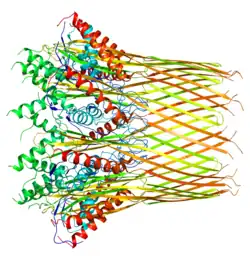 The Curli protein is a type of amyloid fiber produced by certain strains of enterobacteria. They are extracellular fibers located on bacteria such as E. coli and Salmonella spp.[2] These fibers serve to promote cell community behavior through biofilm formation in the extracellular matrix. Amyloids are associated with several human neurodegenerative diseases such as Alzheimer's disease, Huntington's disease, Parkinson's disease, and prion diseases.[2][3] The study of curli may help to understand human diseases thought to arise from improper amyloid fiber formation.[2] The curli pili are generally assembled through the extracellular nucleation precipitation pathway.[4]