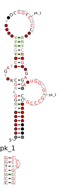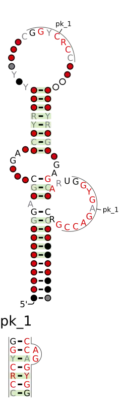 ![]() Consensus secondary structure and sequence conservation of c-di-GMP-II-GAG riboswitch | |