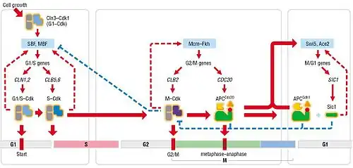 - ↑ Skotheim JM, Di Talia S, Siggia ED, Cross FR (July 2008). "Positive feedback of G1 cyclins ensures coherent cell cycle entry". Nature. 454 (7202): 291–296. Bibcode:2008Natur.454..291S. doi:10.1038/nature07118. PMC 2606905. PMID 18633409.