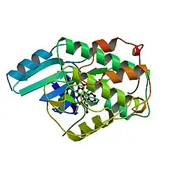 Cyclin-dependent kinase 1 also known as CDK1 or cell division cycle protein 2 homolog is a highly conserved protein that functions as a serine/threonine protein kinase, and is a key player in cell cycle regulation.[5] It has been highly studied in the budding yeast S. cerevisiae, and the fission yeast S. pombe, where it is encoded by genes cdc28 and cdc2, respectively.[6] With its cyclin partners, Cdk1 forms complexes that phosphorylate a variety of target substrates (over 75 have been identified in budding yeast); phosphorylation of these proteins leads to cell cycle progression.[7]