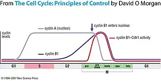 {{cite book}}:|journal=ignored (help) - ↑ Hagting A, Jackman M, Simpson K, Pines J (1999). "Translocation of cyclin B1 to the nucleus at prophase requires a phosphorylation-dependent nuclear import signal". Current Biology. 9 (13): 680–689. Bibcode:1999CBio....9..680H. doi:10.1016/S0960-9822(99)80308-X. PMID 10395539. S2CID 10697376.