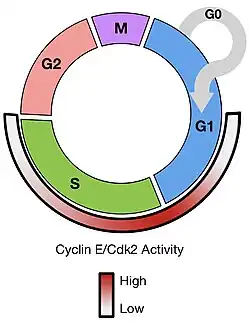 In living cells, over-expression (an excess amount) of either cyclin E type results in an earlier activation of the cyclin E/Cdk2 complex and the subsequent shortening of G1 phase and thus accelerated movement into S phase.[1] The cyclin E/Cdk2 complex is not only important in regulating the G1/S transition, but in fact necessary and sufficient, as cells lacking functional cyclin E are unable to enter S phase, remaining forever arrested in G1.[1]