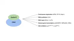 - 1 2 3 4 5 6 Fagundes, Rafaela; Teixeira, Leonardo K. (2021). "Cyclin E/CDK2: DNA Replication, Replication Stress and Genomic Instability". Frontiers in Cell and Developmental Biology. 9. doi:10.3389/fcell.2021.774845. ISSN 2296-634X. PMC 8652076. PMID 34901021.