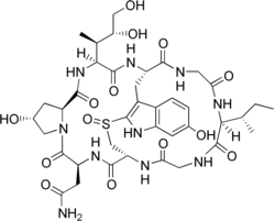 Cyclic peptides are polypeptide chains which contain a circular sequence of bonds.[1] This can be through a connection between the amino and carboxyl ends of the peptide, for example in cyclosporin; a connection between the amino end and a side chain, for example in bacitracin; the carboxyl end and a side chain, for example in colistin; or two side chains or more complicated arrangements, for example in alpha-amanitin. Many cyclic peptides have been discovered in nature and many others have been synthesized in the laboratory. Their length ranges from just two amino acid residues to hundreds. In nature they are frequently antimicrobial or toxic; in medicine they have various applications, for example as antibiotics and immunosuppressive agents.[2] Thin-Layer Chromatography (TLC) is a convenient method to detect cyclic peptides in crude extract from bio-mass.[3]