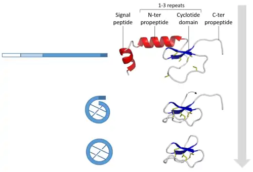 - 1 2 3 Dutton JL, Renda RF, Waine C, Clark RJ, Daly NL, Jennings CV, Anderson MA, Craik DJ (November 2004). "Conserved structural and sequence elements implicated in the processing of gene-encoded circular proteins" (PDF). The Journal of Biological Chemistry. 279 (45): 46858–67. doi:10.1074/jbc.M407421200. PMID 15328347.
