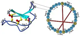 Cyclotides have a well-defined three-dimensional structure due to their interlocking disulfide bonds and cyclic peptide backbone. Backbone loops and selected residues are labeled on the structure to help orientation. The amino acid sequence (single-letter amino acid representation) for this peptide is indicated on the sequence diagram to the right. One of the interesting features of cyclic peptides is that knowledge of the peptide sequence does not reveal the ancestral head and tail; knowledge of the gene sequence is required for this.[5] In the case of kalata B1 the indicated glycine (G) and asparagine (N) amino acids are the terminal residues that are linked in a peptide bond to cyclize the peptide.