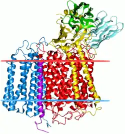 ![]() Bacterial cytochrome c oxidase complex. Subunit II indicated by blue. | |||||||||