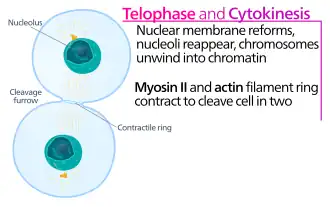 Animal cell cytokinesis begins shortly after the onset of sister chromatid separation in the anaphase of mitosis. The process can be divided to the following distinct steps: anaphase spindle reorganization, division plane specification, actin-myosin ring assembly and contraction, and abscission.[5] Faithful partitioning of the genome to emerging daughter cells is ensured through the tight temporal coordination of the above individual events by molecular signaling pathways.