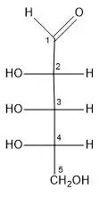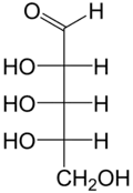 Ribose is a simple sugar and carbohydrate with molecular formula C5H10O5 and the linear-form composition H−(C=O)−(CHOH)4−H. The naturally occurring form, d-ribose, is a component of the ribonucleotides from which RNA is built, and so this compound is necessary for coding, decoding, regulation and expression of genes. It has a structural analog, deoxyribose, which is a similarly essential component of DNA. l-ribose is an unnatural sugar that was first prepared by Emil Fischer and Oscar Piloty in 1891.[4] It was not until 1909 that Phoebus Levene and Walter Jacobs recognised that d-ribose was a natural product, the enantiomer of Fischer and Piloty's product, and an essential component of nucleic acids.[5][6][7] Fischer chose the name "ribose" as it is a partial rearrangement of the name of another sugar, arabinose, of which ribose is an epimer at the 2' carbon; both names also relate to gum arabic, from which arabinose was first isolated and from which they prepared l-ribose.[7][8]