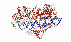 ![]() Cartoon representation of Arabidopsis DCL3 (red) in complex with 41nt TAS1a reverse strand (blue), based on atomic coordinates of PDB 7VG2 (Wang Q. et al 2021), rendered with open software Mol Star. | |||||||