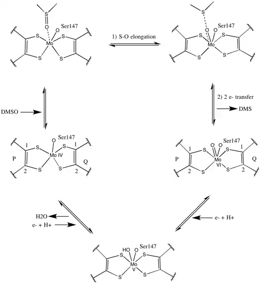 - ↑ McAlpine AS, McEwan AG, Shaw AL, Bailey S (1997). "Molybdenum active centre of DMSO reductase from Rhodobacter capsulatus: crystal structure of the oxidised enzyme at 1.82-A resolution and the dithionite-reduced enzyme at 2.8-A resolution". Journal of Biological Inorganic Chemistry. 2 (6): 690–701. doi:10.1007/s007750050185. S2CID 23027986.