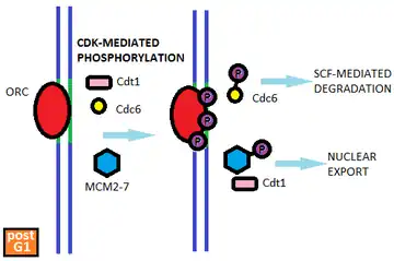 Rereplication regulation is best understood in budding yeast. Saccharomyces cerevisiae cells prevent rereplication by directly regulating pre-RC assembly through the CDK-mediated phosphorylation of the pre-RC components Cdc6, MCM2-7, and the ORC subunits.[5] The phosphorylation of these components is initiated at the onset of S phase and is maintained throughout the rest of the cell cycle as CDK activity remains high. Phosphorylated Cdc6 is bound by the ubiquitin-protein ligase SCF which leads to its proteolytic degradation. CDK-dependent phosphorylation of the MCM2-7 proteins results in the complex's export from the nucleus. (Cdt1 which associates with the MCM complex is similarly exported from the nucleus). Phosphorylation of the ORC subunits presumably disrupts the ORC's ability to bind other pre-RC components.[5] Thus, multiple mechanisms ensure that the pre-RC cannot be reassembled on postreplicative origins.