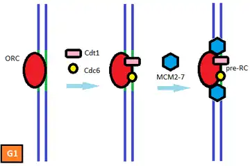 - ↑ Cvetic CA, Walter JC (January 2006). "Getting a grip on licensing: mechanism of stable Mcm2-7 loading onto replication origins". Molecular Cell. 21 (2): 143–4. doi:10.1016/j.molcel.2006.01.003. PMID 16427002.