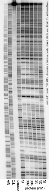DNase I footprint of a protein binding to a radiolabelled DNA fragment. Lanes "GA" and "TC" are Maxam-Gilbert chemical sequencing lanes, see DNA Sequencing. The lane labelled "control" is for quality control purposes and contains the DNA fragment but not treated with DNase I.