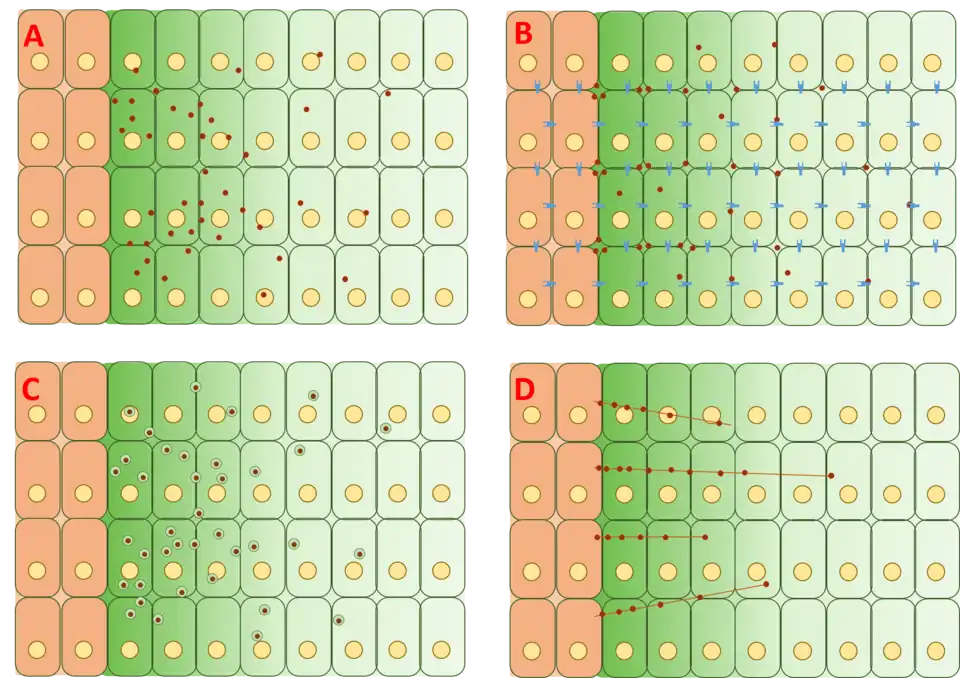 However, the mechanism by which the Dpp gradient is formed is still controversial, and no complete explanation has been proposed or proven. The four main categories of theories behind the formation of the gradient are free diffusion, restricted diffusion, transcytosis, and cytoneme-assisted transport.