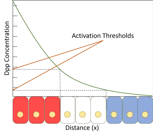 Dpp is a classic morphogen, which means that it is present in a spatial concentration gradient in the tissues where it is found, and its presence as a gradient gives it functional meaning in how it affects development. The most studied tissues in which Dpp is found are the early embryo and the imaginal wing discs, which later form the wings of the fly. During embryonic development, Dpp is uniformly expressed at the dorsal side of the embryo, establishing a sharp concentration gradient.[2] In the imaginal discs, Dpp is strongly expressed in a narrow stripe of cells down the middle of the disc where the tissue marks the border between the anterior and posterior sides. Dpp diffuses from this stripe towards the edges of the tissue, forming a gradient as expected of a morphogen. However, although cells in the Dpp domain in the embryo do not proliferate, cells in the imaginal wing disc proliferate heavily, causing tissue growth.[1] Although gradient formation in the early embryo is well understood, how the Dpp morphogen gradient forms in the wing imaginal disc remains controversial.