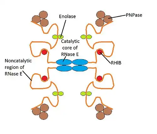 - ↑ Bandyra KJ, Bouvier M, Carpousis AJ, Luisi BF (June 2013). "The social fabric of the RNA degradosome". Biochimica et Biophysica Acta (BBA) - Gene Regulatory Mechanisms. 1829 (6–7): 514–22. doi:10.1016/j.bbagrm.2013.02.011. PMC 3991390. PMID 23459248.