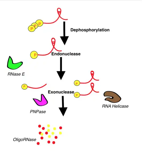 The RNA's destruction process is very complicated. To make it easier to understand, we use as an example the mRNA degradation procedure in Escherichia coli because it is the best known process. It is mediated mainly by endo- and ribo- nucleases. The enzymes RNase II and PNPase (polynucleotide phosphorylase) degrade mRNA in a 3'→5' way. The degradosome has 4 compartments that have several ribonucleases. Initially, the synthesized RNA is a polyphosphate structure. This is why the dephosphorylation is needed, in order to obtain monophosphate by the action of a RNA pyrophosphohydrolase PppH. The transcripts have two parts: the phosphate terminal (P-terminal) and a stem-loop structure as an end. The P-terminal is endoribonucleolytically cleavaged by RNase E, while the stem-loop is digested by RNA helicases. If there are any secondary structures, the performance of polymerase PAP is needed to simplify the reduction by exoribonucleases such as PNPase. Finally, the scraps are processed by oligoribonucleases.