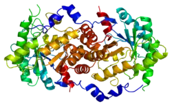 Aminolevulinic acid dehydratase (porphobilinogen synthase, or ALA dehydratase, or aminolevulinate dehydratase) is an enzyme (EC 4.2.1.24) that in humans is encoded by the ALAD gene.[5][6] Porphobilinogen synthase (or ALA dehydratase, or aminolevulinate dehydratase) synthesizes porphobilinogen through the asymmetric condensation of two molecules of aminolevulinic acid. All natural tetrapyrroles, including hemes, chlorophylls and vitamin B12, share porphobilinogen as a common precursor. Porphobilinogen synthase is the prototype morpheein.[7]