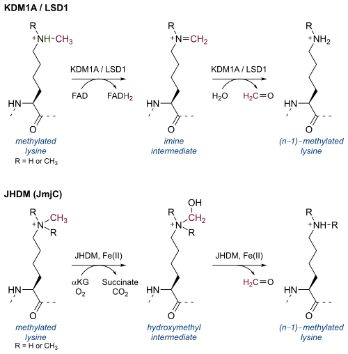 Histone methylation was initially considered an effectively irreversible process as the half-life of the histone methylation was approximately equal to the histone half-life.[1] Histone lysine demethylase LSD1 (later classified as KDM1A) was first identified in 2004 as a nuclear amine oxidase homolog.[2] Two main classes of histone lysine demethylases exist, defined by their mechanisms: flavin adenine dinucleotide (FAD)-dependent amine oxidases and α-ketoglutarate-dependent hydroxylases.