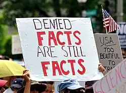 Anthropologist Didier Fassin distinguishes between denial, defined as "the empirical observation that reality and truth are being denied", and denialism, which he defines as "an ideological position whereby one systematically reacts by refusing reality and truth".[10] Persons and social groups who reject propositions on which there exists a mainstream and scientific consensus engage in denialism when they use rhetorical tactics to give the appearance of argument and legitimate debate, when there is none.[6][7][11] It is a process that operates by employing one or more of the following five tactics to maintain the appearance of legitimate controversy:[6][12]