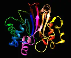 Deoxyribonuclease I (usually called DNase I), is an endonuclease of the DNase family coded by the human gene DNASE1.[5] DNase I is a nuclease that cleaves DNA preferentially at phosphodiester linkages adjacent to a pyrimidine nucleotide, yielding 5'-phosphate-terminated polynucleotides with a free hydroxyl group on position 3', on average producing tetranucleotides. It acts on single-stranded DNA, double-stranded DNA, and chromatin. In addition to its role as a waste-management endonuclease, it has been suggested to be one of the deoxyribonucleases responsible for DNA fragmentation during apoptosis.[6]