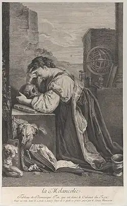 During the 18th century, the humoral theory of melancholia was increasingly being challenged by mechanical and electrical explanations; references to dark and gloomy states gave way to ideas of slowed circulation and depleted energy.[84] German physician Johann Christian Heinroth, however, argued melancholia was a disturbance of the soul due to moral conflict within the patient.